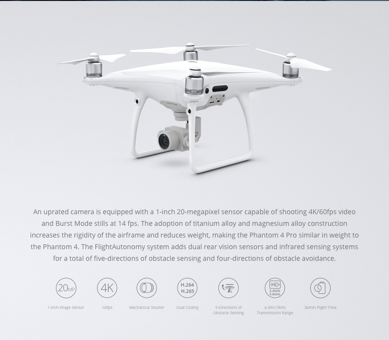AircraftDiagonal Size (Propellers Excluded): 350 mmMax Tilt Angle:- S-mode: 42 degree – A-mode: 35 degree – P-mode: 25 degree Max Angular Speed:- S-mode: 250 degree /s- A-mode: 150 degree /sMax Service Ceiling Above Sea Level: 19685 feet (6000 m)Operating Temperature Range: 32 degree to 104 degree F (0 degree to 40 degree C)Satellite Positioning Systems: GPS/GLONASSVision SystemVision System: Forward Vision SystemBackward Vision SystemDownward Vision SystemVelocity Range: =31 mph (50 kph) at 6.6 ft (2 m) above groundAltitude Range: 0 – 33 feet (0 – 10 m)Operating Range: 0 – 33 feet (0 – 10 m)Obstacle Sensory Range: 2 – 98 feet (0.7 – 30 m)FOV: Forward: 60 degree (Horizontal), +/-27 degree (Vertical)Backward: 60 degree (Horizontal), +/-27 degree (Vertical)Downward: 70 degree (Front and Rear), 50 degree (Left and Right)Measuring Frequency: Forward: 10 HzBackward: 10 HzDownward: 20 HzOperating Environment: Surface with clear pattern and adequate lighting (lux>15)GimbalStabilization: 3-axis (pitch, roll, yaw)Controllable Range: Pitch: -90 degree to +30 degree Max Controllable Angular Speed: Pitch: 90 degree /sAngular Control Accuracy: +/-0.02 degree Infrared Sensing SystemObstacle Sensory Range: 0.6 – 23 feet (0.2 – 7 m)FOV: 70 degree (Horizontal), +/-10 degree (Vertical)Measuring Frequency: 10 HzOperating Environment: Surface with diffuse reflection material, and reflectivity > 8% (such as wall, trees, humans, etc.)